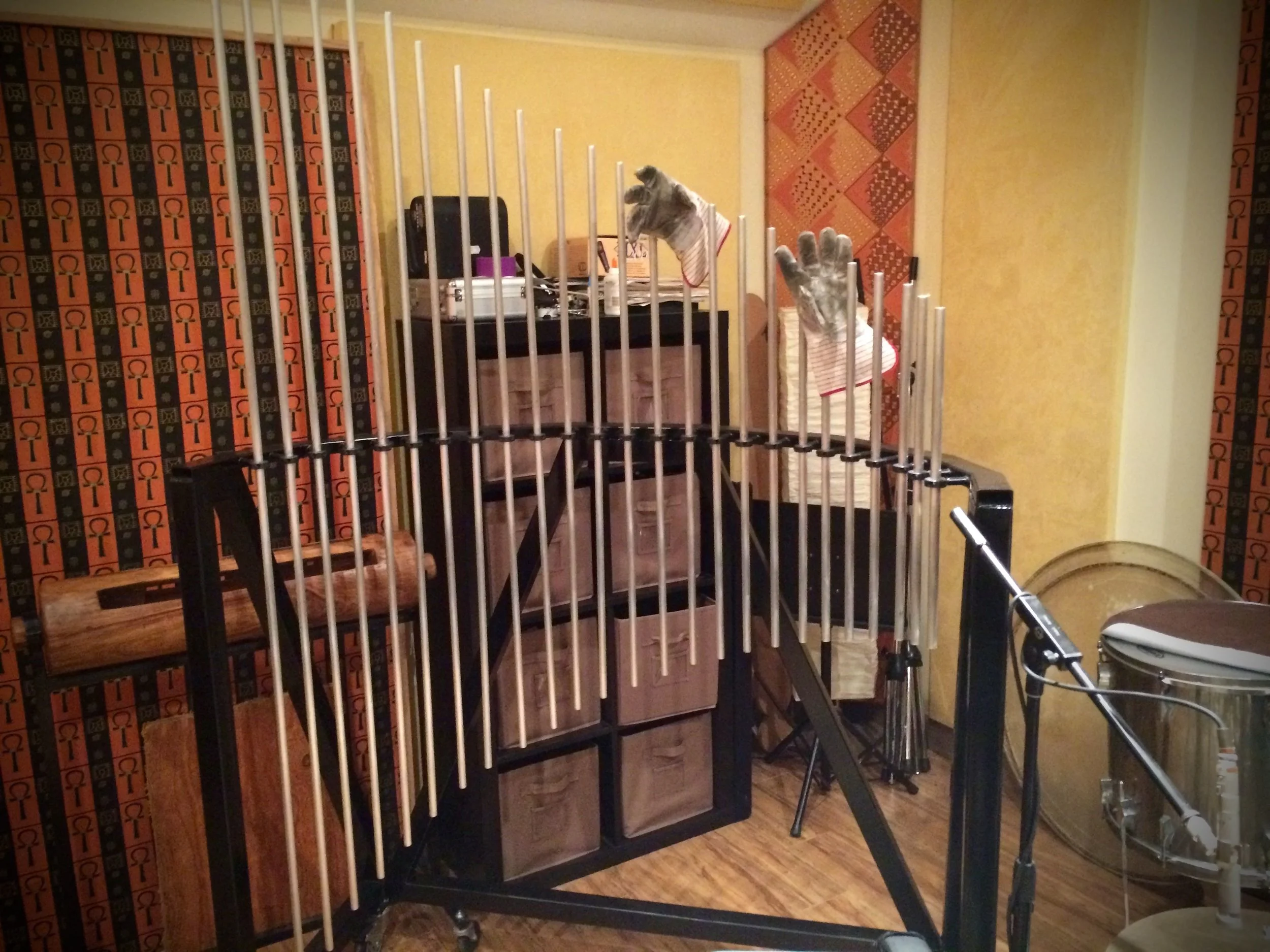 Huge array of shakers, woodblocks, triangles, cowbells,